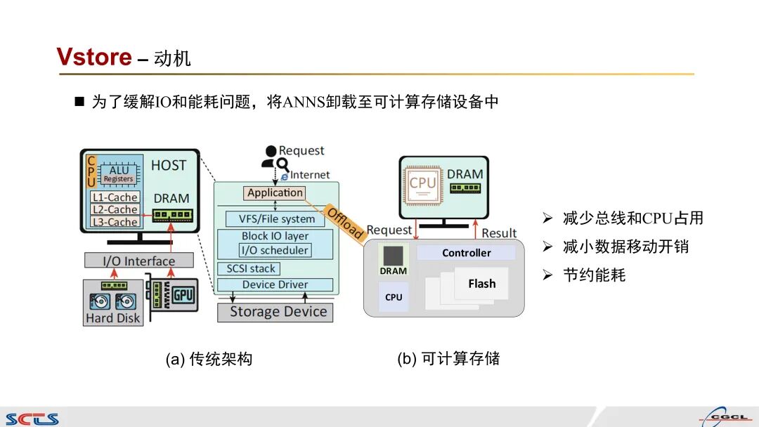 所以为了在大规模的销量数据集上提供一个更高成本效益的一个方案,然后这篇文章提出了一种基于可计算存储的向量搜索的解决方案。它是将原本的基于图的向量搜索这样一个功能,全部都卸载到了可计算存储设备内部,然后让可计算存储设备做相应搜索,将结果直接返回给主机。而不是说在搜索的过程中,主机不断地从SSD当中出取数据,再计算结果。这样的话,由于数据的读取和计算都是在存储器内部,那么就避免了我们传统操作系统当中这些复杂的一个数据 I/O 的存储栈,还释放了我们 CPU 和 DRAM 的一个内存资源。