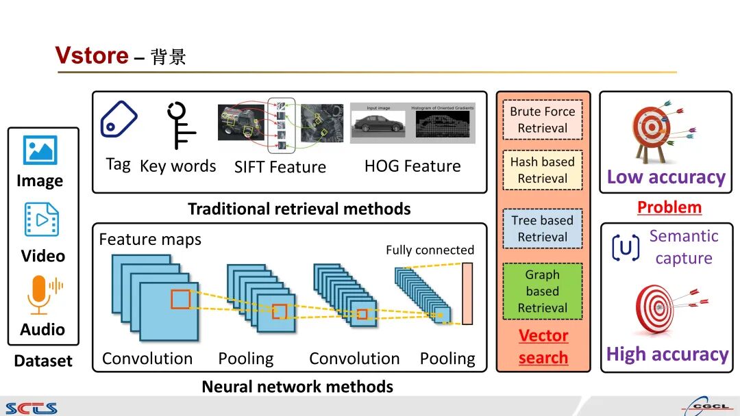 以非结构化数据的检索为例,传统的解决方案是利用手动特征对图像进行检索,他们的检索的准确度往往都比较低,质量会比较差。但是目前随着深度学习的不断发展,现有是利用一个深度的神经网络技术来获取我们文本,图片还有视频的一个语义特征,将它们映射到一个高维的 embedding上面,以获得更高的一个检索的准确度,那么这一种非结构化的数据在经过神经网络进行编码为高维向量之后,剩下的工作就是我们今天要讲的向量搜索了。