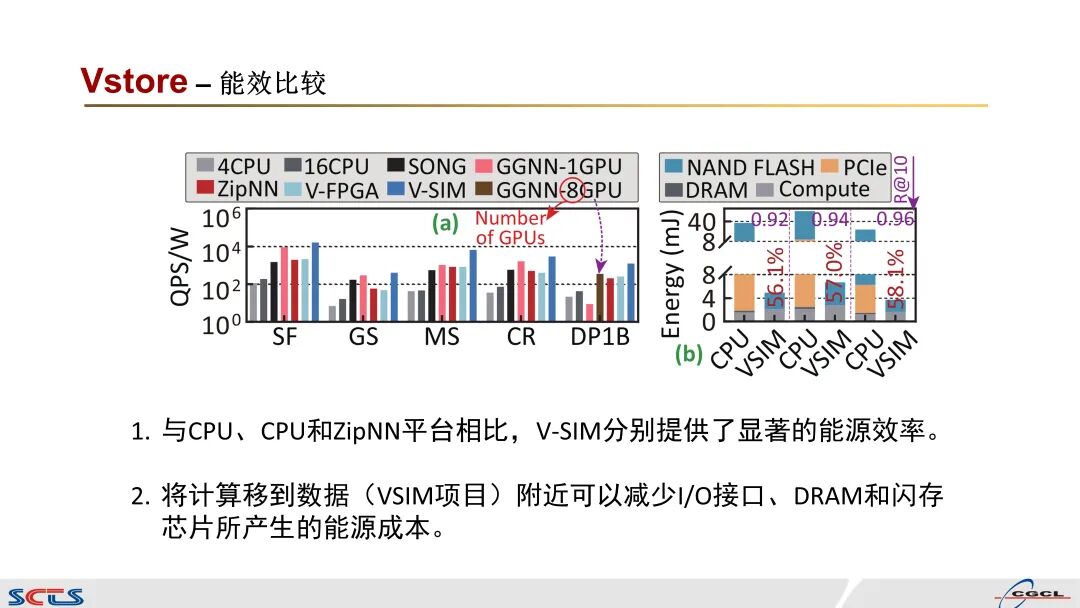 对于能源效率的话,这个 V-FPGA 就是这个浅蓝色是要明显的比 CPU 的方案要好。他们这个模拟器的方案是比所有的方案都要好,FPGA的方案他们可能比不过 GPU 或者说其他优化的方案,但是他们这个模拟器的方案是要比所有的方案都要好。这是由于他们将计算移动到了数据附近,减少了主机到 SSD 的一个 I/O 接口,还有主机的 DRAM 以及闪存芯片所产生的能源成本。