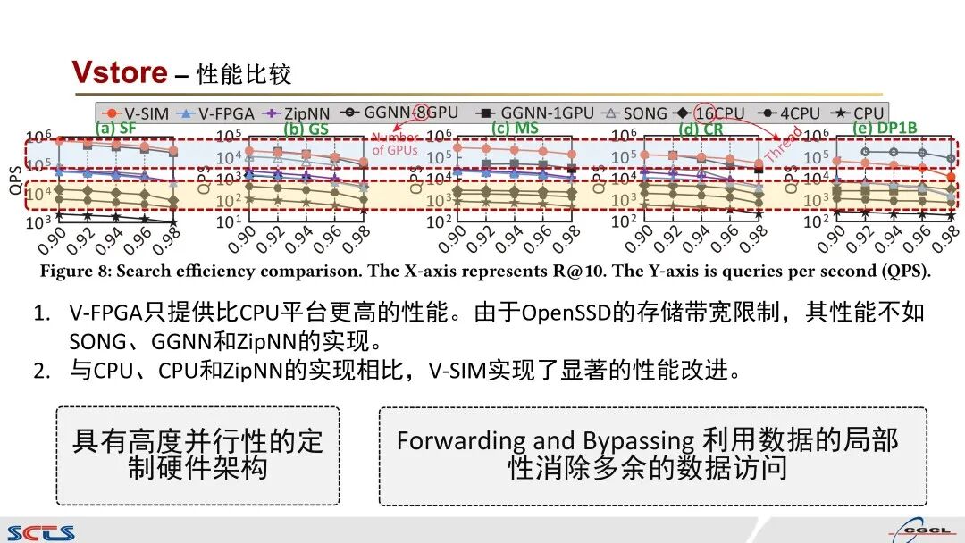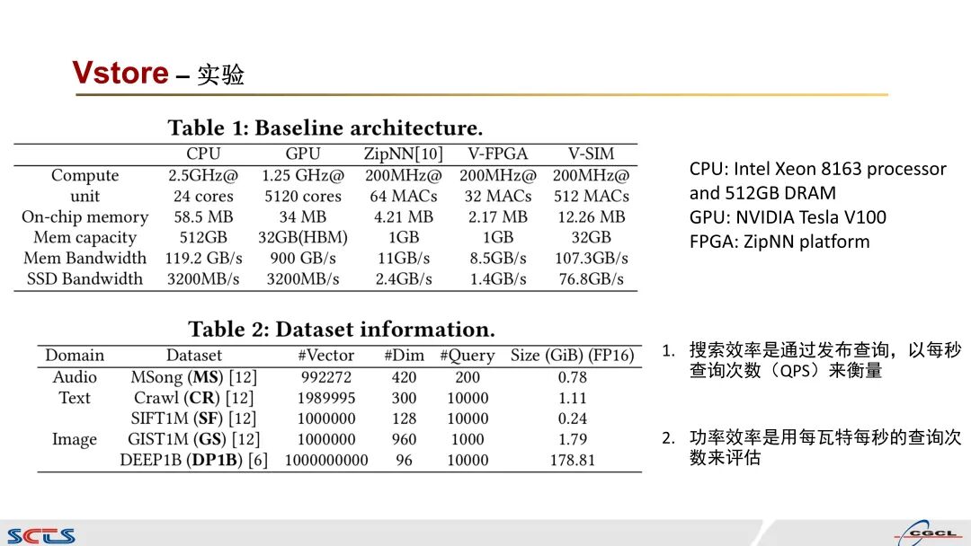 以上就是大致的 SSD 内部的加速器的设计,然后他们实验用 FPGA 做了一个硬件,又做了一个模拟器的方案,他们分别采用了三种矢量搜索平台作为一个评估基准,分别是CPU, GPU 和 ZipNN。实验是选择了 5 种不同规模的数据集,然后通过 QPS 来衡量它们的搜索效率。功耗的话它们是主要通过功率的,效率就是每瓦特每秒的查询次数来评估,后面主要对这两个指标进行介绍。