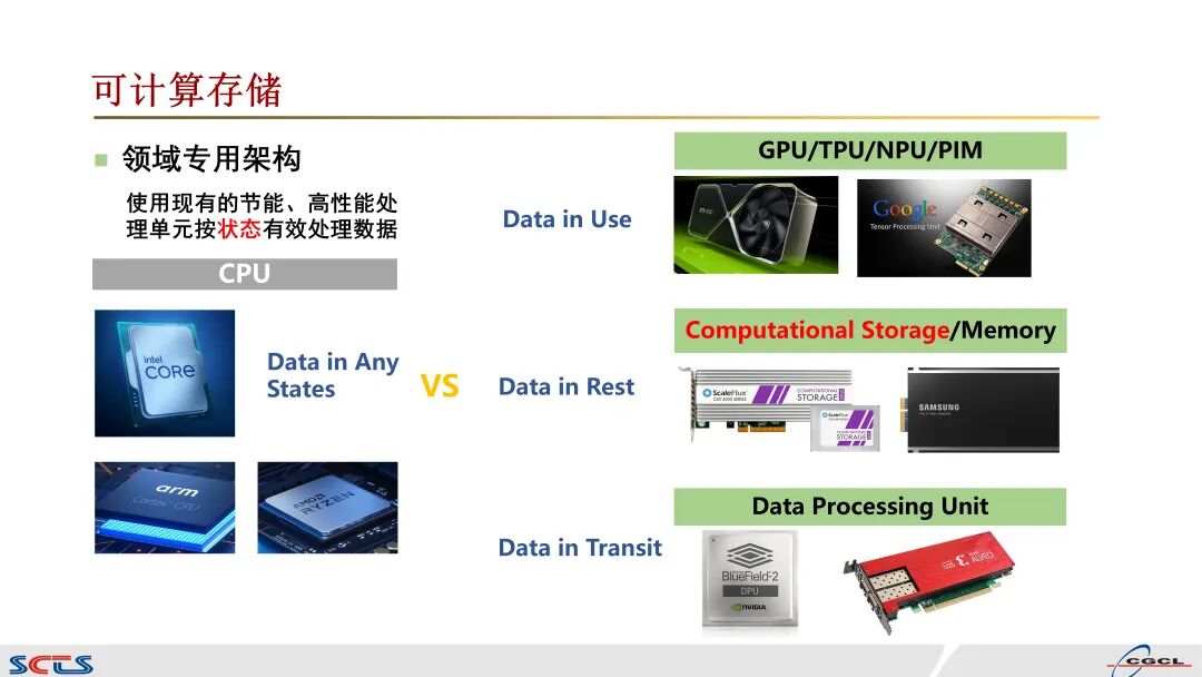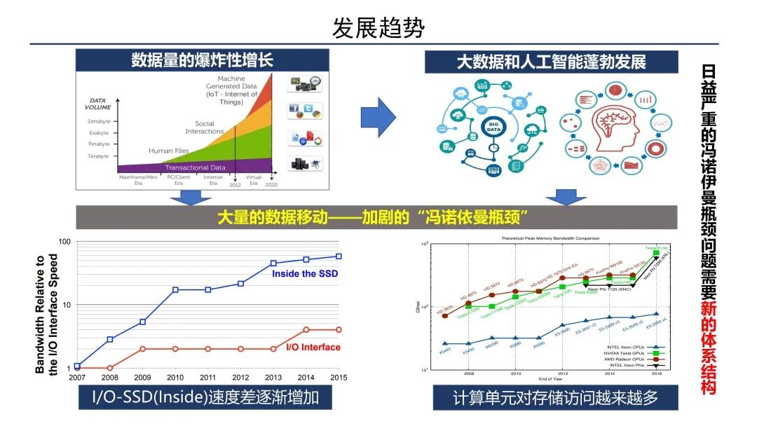 那么什么是冯诺依曼瓶颈?我们都知道传统的计算机架构是以计算为中心,是计算与存储分离,如果想要计算的话,就是存储器先把它的数据给传输给计算器再进行计算。我们前面也提到了,现在的 CPU 的性能是不断地提高,存储器的容量也不断的增大,但是它们之间的数据传输却存在着一个很大的问题。第一个问题是首先是数据的传输速度是比较慢的,因为在存储内存储器内部,它海量的数据都需要经过系统的这个 I/O 的总线,就是处理器和存储器之间的数据总线,然后之后才能传输给CPU。然后其次是数据传输的一个能耗比较大。那么对于像人工智能还有图计算这种 I/O 密集型的应用来说,数据搬运的能耗其实是远远大于我们 CPU 计算的一个能耗的。那么为了解决我们现有的这样一种冯诺依曼的瓶颈,现在是去中心化的领域专用架构正在迅速的一个发展的趋势。这样一个架构是利用各种高性能的一个处理单元,然后来对数据按照状态来进行处理,实现一个数量级的性能提升,并且更低的一个功耗。比如说现在我们都知道的GPU,然后 TPU,还有 NPU 。这些是主要是数据在使用的时候我们去做计算,比如训练神经网络这些东西。我们这次活动的主办方他们做的这个类脑计算,还有这个 PIM 就是存内计算,就是内存内计算,然后也在快速地发展。此外数据我们在传输的时候,我们都知道是CPU,在它要对网络的包进行一个处理,这个处理任务负担还是比较大的。可计算存储就是基于移动计算比移动数据更高效的思想,在数据存储的地方来做计算,这样可以充分利用我们存储器内部的带宽,来减少因数据移动它带来的开销。