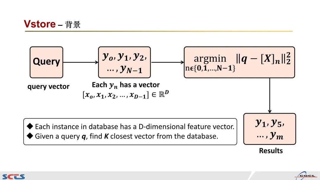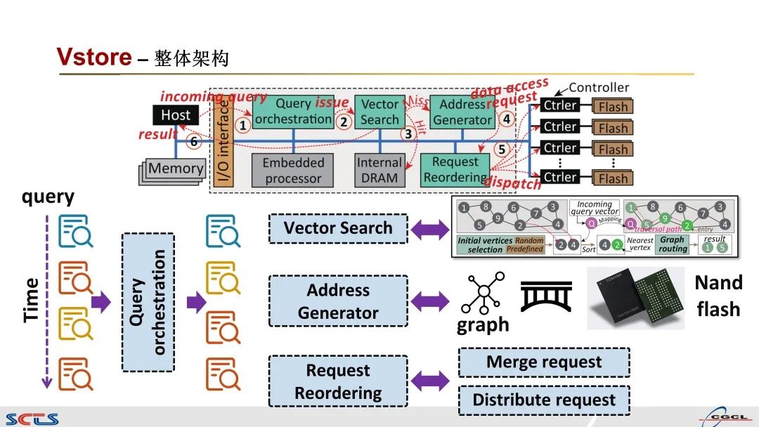 Vstore 这篇文章它是嵌入到了 SSD 的控制器内部,可以看到它是有 4 个模块的,分别是查询编排引擎、向量搜索引擎、地址生成器和最后的请求编排。那么查询编排引擎就是负责重新的组织传入的查询的执行顺序,因为它之前观察到的现象就是如果两个查询向量的距离比较近的话,那么它们在查询过程中数据的重用率比较高,所以它们就利用这样一个特性,然后做了一个查询的请求编排,让相似的查询之间按顺序的进行执行,这样的话数据重用率就比较高。然后向量搜索引擎就是对基于图的向量搜索算法做了一个定制化的芯片加速器,把原来基于图的向量搜索给硬件化了。后面我主要是对以下这 3 个做详细地介绍。
