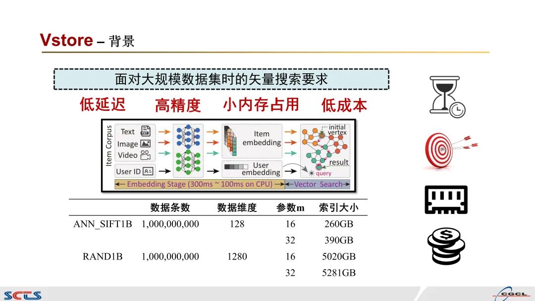 然而随着语义信息丰富的数据集增多,基于图的向量搜索也对数据中心的生产系统提出了更高的要求和挑战。首先需要以更低的延迟进行搜索,并且还要达到更高的准确度。以推荐系统为例,就是由于我们查询必须在到达现在搜索阶段之前,穿过多个阶段。因此现在搜索其实它的执行时间仅仅就是要求为微妙级别,甚至是更短。但是如果我们使用 CPU 来查询 10 亿规模的一个向量数据集的话,实际上所需要的时间要超过 100 毫秒。其次是我们需要更小的内存占用,还有更低的成本。虽然我们基于图的向量搜索,它表现出非常优异的查询性能,但是这样一种结构,它消耗会消耗大量的一个内存空间,比如这个SIFT1Billion。对于 10 亿级规模的话,如果我们要在这样一个数据集上构建一个图的话,它的索引大小就就要占到 200 多GB,那么 200 多个 GB 实际上是就是对数据中心内存空间的压力还是比较大的,所以如果我们能减少小的内存占用,那么就可以释放我们机器上搜索阶段所占用的资源,然后来降低数据中心的总的一个拥有的成本。