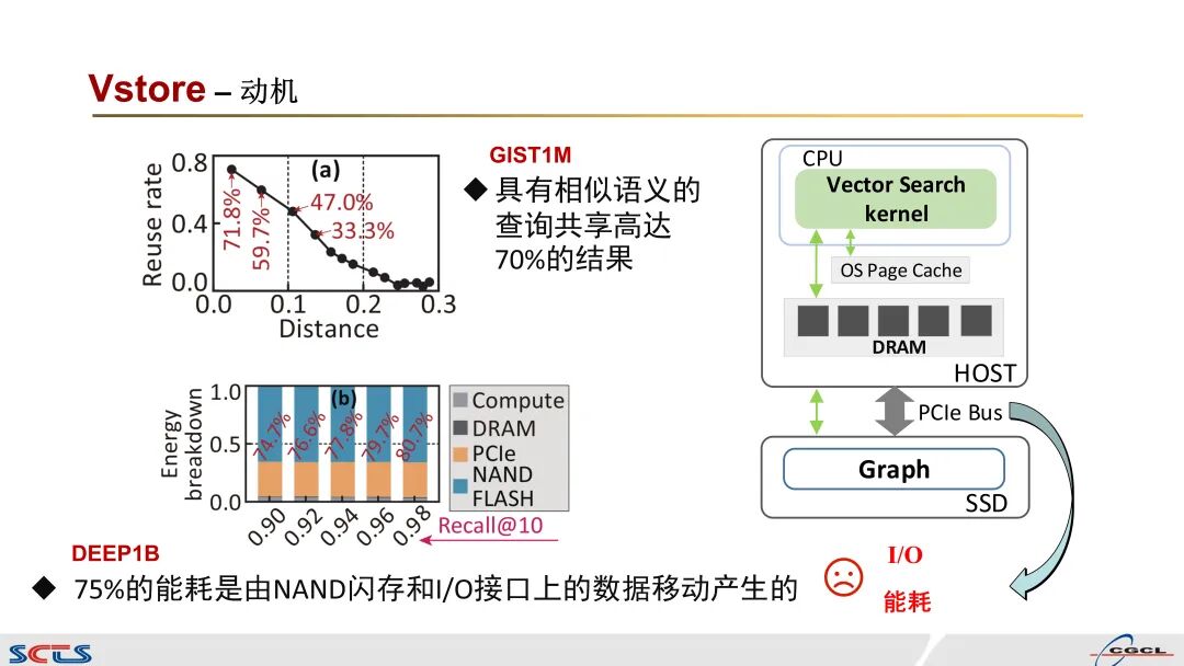 所以为了从应用层面和系统层面对这个相应搜索进行分析,这篇文章它们是分别运行了 GIST1M 和 DEEP1B 这两个数据集,那么对于应用层面,他们在执行相似的查询过程中顶点的轨迹,可以发现如果两个查询他们的距离特别近的话,那么他们在迭代查询的过程中实际上是会有大量的数据是被重用的。同时对于系统层面的话,如果将 DEEP1B 的图的索引和相应的数据全都存储到 SSD 的话,那么可以发现大约有 75% 的总的能耗的一个消耗是由 NAND闪存芯片,还有 I/O 接口之间的数据传输产生的那么这样一种现象就表现出一个显著的 I/O 瓶颈问题。