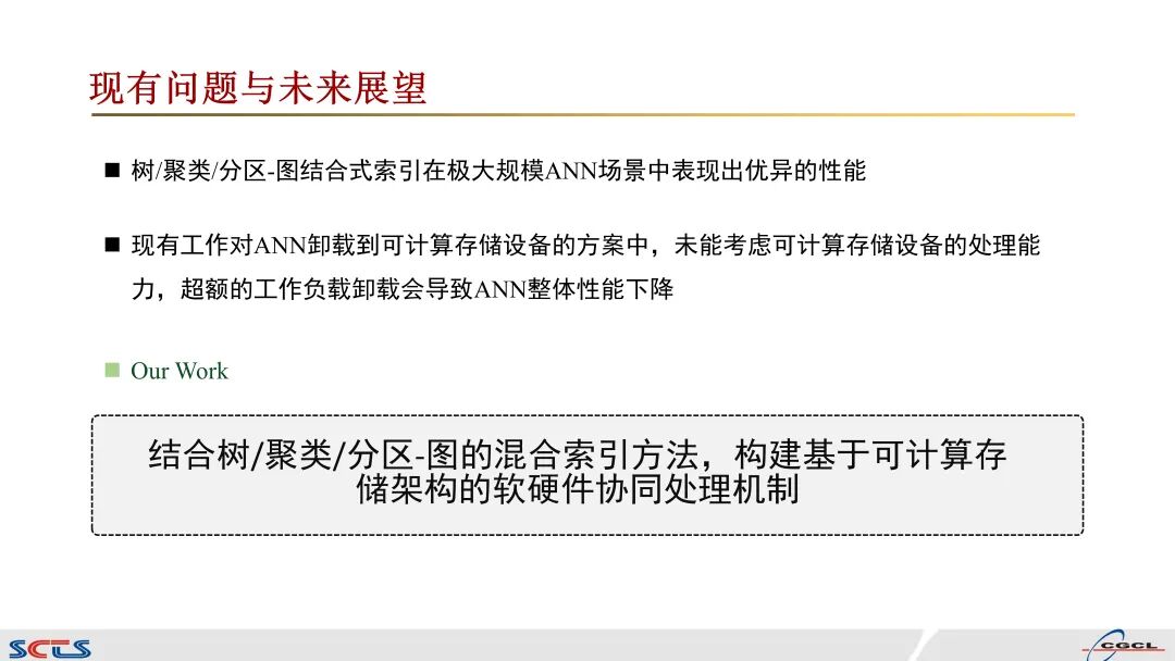 然后以上就是Vstore它这篇文章的主要内容,这篇文章由于它是发表在了 DAC 上面, 6 页左右,所以说内容会比较紧凑,然后比较少。通过以上的分享,我们基于他们的工作,我们也有了一些思考。然后首先就是对于磁盘这样一种方案,它的数据集规模往往是非常大的,比如说 10 亿级别或者说百亿级别,那么这样一种情况下,我们还按照原来单个基于图的索引的方案的话,可能并不能达到非常好的一个性能。目前的研究方案表明,通过基于树和图的结合,或者说基于聚类,或者基于分区与图的结合这样一种索引,在超大规模的ANN场景中会表现出一个更好的一个性能。因为我们可计算存储的话,它主要针对的场景,也就是我们平常在主机里面,就是在 DRAM 里面数据集放不下,然后存储到 SSD 里,那存储的SSD 里就是对应着超大规模的一个情况。并且我们还发现就是现有的工作对这个 ANN卸载到可计算存储设备的方案中,实际上都没有考虑到可计算存储设备的一个处理能力,并且还没有考虑到就是有了主机的 CPU 和存储器的可计算存储这样一种异构的计算资源环境它们之间的协作的可能。