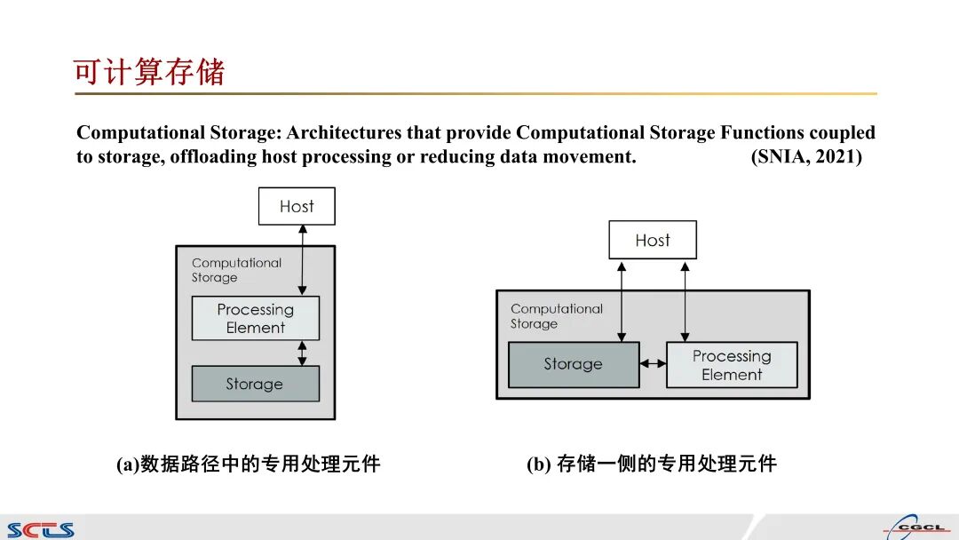 这里我引用了存储与网络协会对可计算存储的定义,它是一种能够提供与存储仅耦合的可以计算的功能,就是赋予存储器一定的计算资源,将 CPU的一部分计算任务给卸载到存储器内部,来减少数据移动的开销。这里是两个可计算存储的通用架构,那么左边是 off-path的一个架构,就是说我存储器内部的控制器不仅处理普通的 I/O 的命令,而且还处理我们要卸载的可以计算的函数功能,就是数据的通路都是在一条路上。然后第二种就是 off-path的架构。这种是在存储器内部来,就是单独集成一个可以计算的 FPGA 的计算芯片,然后这个FPGA 计算芯片和存储器连接。