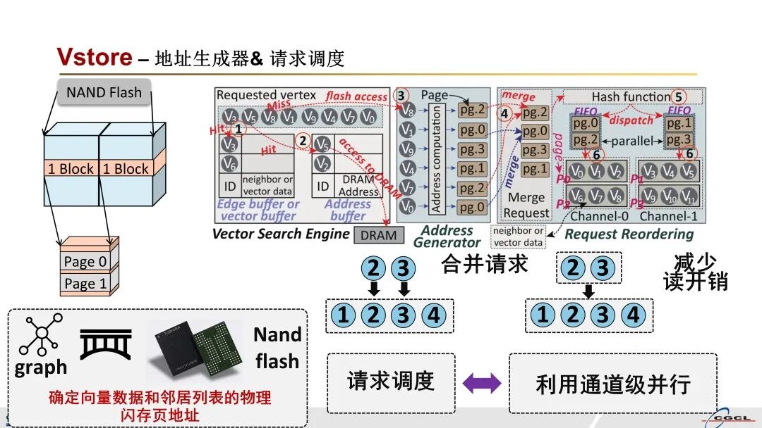 在图上进行不断地迭代,搜索过程中要不断地去请求大量的节点和对应的邻居,然后这里它在 SSD 里面是分别维护了 3 个缓冲区,分别是边缓冲区和顶点缓冲区,还有地址缓冲区。因为在 SSD 的内部它要请求节点或者邻居数据的话,首先要检查对应的缓冲区当中有没有被命中,如果命中的话就直接做计算就可以了。那么如果有命中的话,就要向底层的 flash 上面去取数据。但是我们SSD内部是没有传统操作系统当中文件系统的这样一层抽象的,所以不能够直接去读取数据。这里它是做了一个地址生成器,把向量对应的顶点,映射到对应的闪存的物理页当中。映射之后,如果要读取顶点8,就是要读取 flash 的页面2。但是由于我们闪 SSD 内部它是以页粒度为读取单位的,就是我们每次读取的时候,它的单位都是以页粒度为大小,一个页粒度的大小通常是4KB左右,而我们每个向量和边它们大小通常是几十到几百B这么大。所以说有可能会出现同一个物理页当中包含多个向量顶点和多个邻居,这样的话就可能会出现一种情况,就是数据页面的冗余访问。比如这里有一个情况就是顶点8,它对应的是物理页2,那么在取完顶点 8 之后,后续的请求当中顶点 7 它也要去读取页面2,如果按这样一个顺序指引的话,就是读取了重复的页面2,来去获取顶点 8 和顶点 7 的数据。这样的话实际上增加了读取延迟,这里它是做了一个合并请求的一个方案,就是它也是在内部先缓冲一些请求,依次就是做地址映射,然后比如说得到页面 2 是对应着顶点8,还定还对应着顶点7,那么就将这两个页面请求进行合并,合并成一个请求之后再去发送给闪存的控制器,这样的话就可以减少冗余的页面访问。还有一种情况就是SSD 内部它是实际上是有多个通道。现在 SSD 的高带宽主要的一个原因其实也就是由于它内部是有多个channel,然后多个 channel 可以并行地去工作。所以这篇文章他们为了充分的利用SSD内部的这样一种并行性,他们是做了一个请求的一个类似于请求的一个调度的,他们将每一个到来的闪存的请求,通过一个哈希函数将不同的闪存页请求进行分区,然后这样的话可以就是充分地利用多个 channel并行访问的这样一个优势,来提高数据的读取效率,充分地利用通道级的并行。