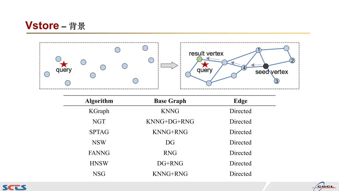现在搜索目前是大概是有 4 种方法,分别是暴力搜索、基于哈希的检索、基于树的检索以及目前比较就是最好的方法就是基于图的检索,基于图的向量搜索,它的核心的基础就是我们把这样一个高维的向量,把它作为点,向量之间的距离,给它表征成为向量之间的边,就是向量之间的距离越近,那么它们就越可能成为邻居。那整个查询的过程大概就是从起始点开始。迭代的从邻居节点,寻找与查询点距离最近的节点,这样不断地在图上进行迭代的查找,直到找到满足我们想要的与查询向量最近的向量的时候,这个时候就是满足了条件,然后才终止。那么由于基于图的方法它表现出非常好的一个性能,所以现在已经有大量的研究工作对基于图的方法做优化,比如说最基础的是KGraph,然后现后来的HNSW ,NSG 等等。