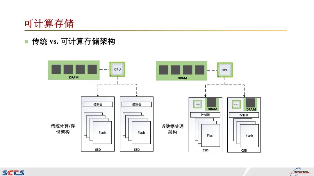 这是宏观上传统架构与可计算存储架构加持的一个进数据处理的对比。所以就是每个存储器的内部我们都可以进行计算了。之后我们就可以对存储器内部添加一些比如说数据库的过滤的操作,或者说一些数据检索的相关功能,并且由于我们有了可计算存储之后,它的扩展机制并不会受到这个 I/O 总线的限制,因为每次扩展的话,它实际上是都是利用了内部的带宽。